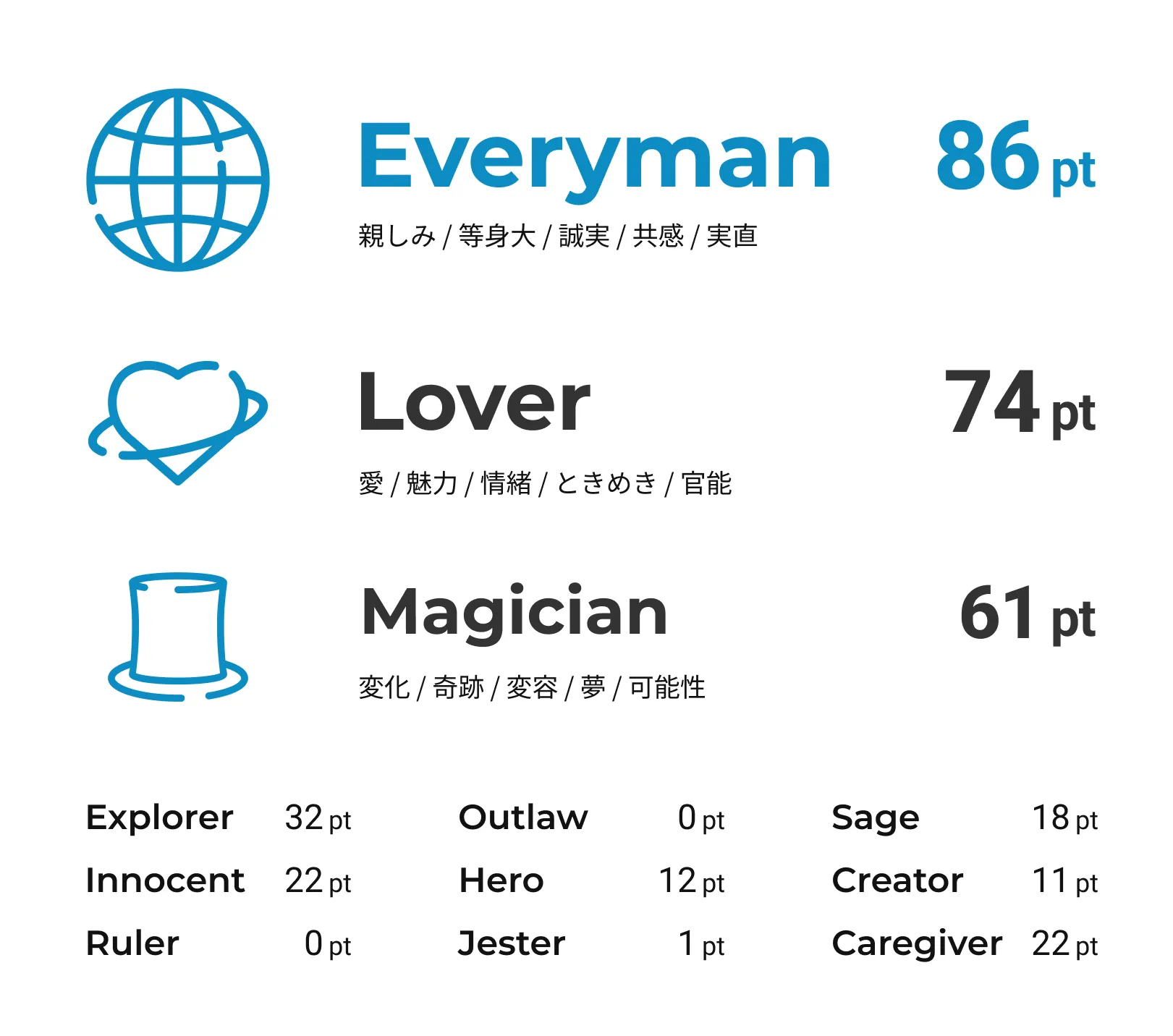 ブランドが持つ雰囲気を、12個の人格タイプに分けて診断します。Webサイトの文章やデザインから、ブランドがどんな性格だと捉えられているのか分析します。