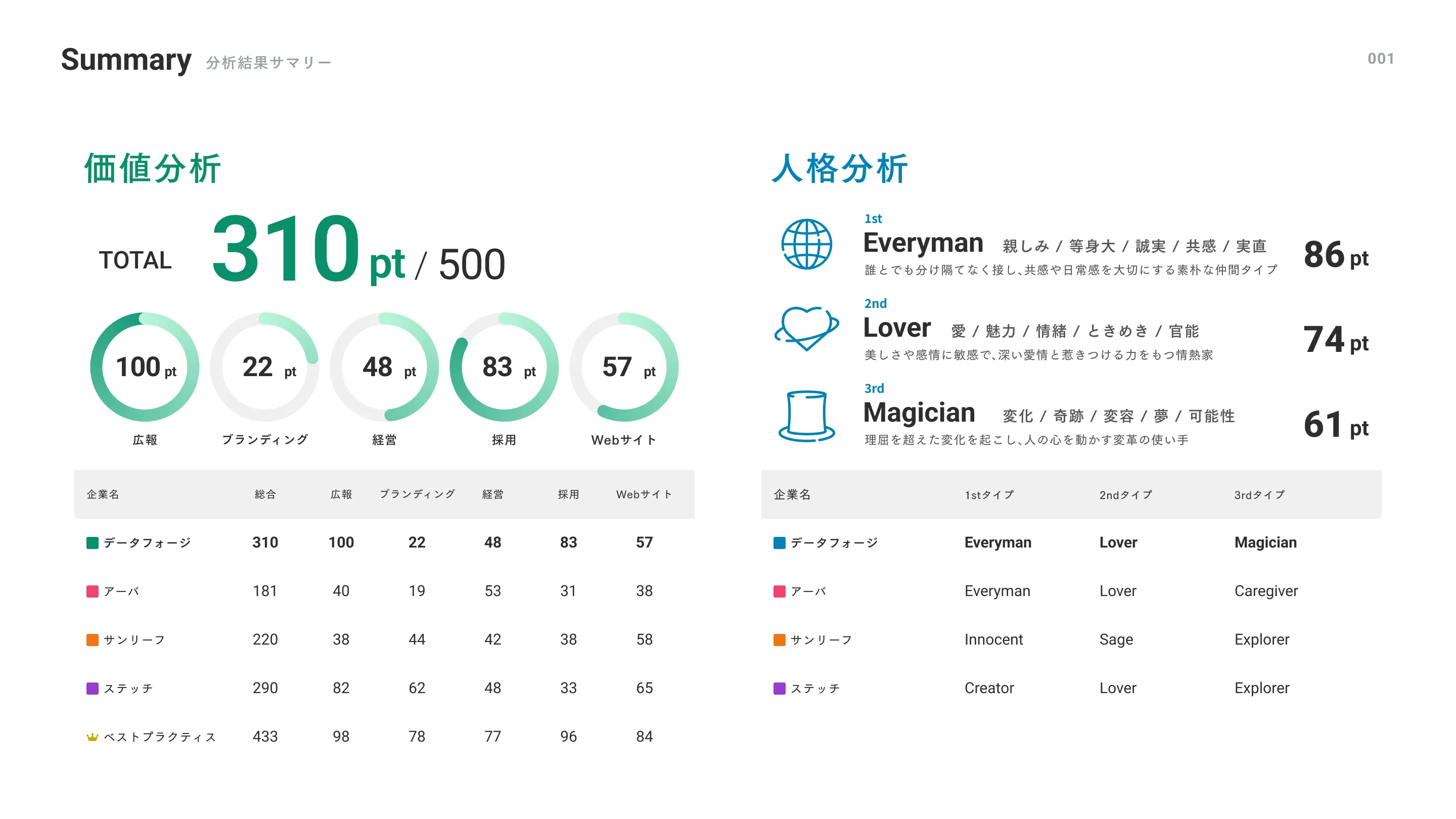 5領域93項目の価値分析と、12タイプ120項目の人格分析を用いて、ブランドを客観的に分析。感覚ではなく、再現性のある指標で評価します。